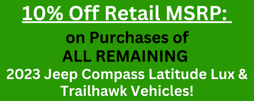 10% Off Retail MSRP on remaining 2023 Jeep Compass Latitudes & Trailhawks!